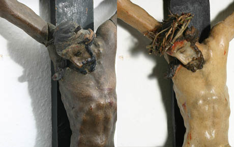 Oberflächenreinigung, Fassungsfestigung, Abnahme von unpassenden Übermalungen, Kittung und Retusche, Holzkonservierung bei Befall von holzzerstörenden Insekten